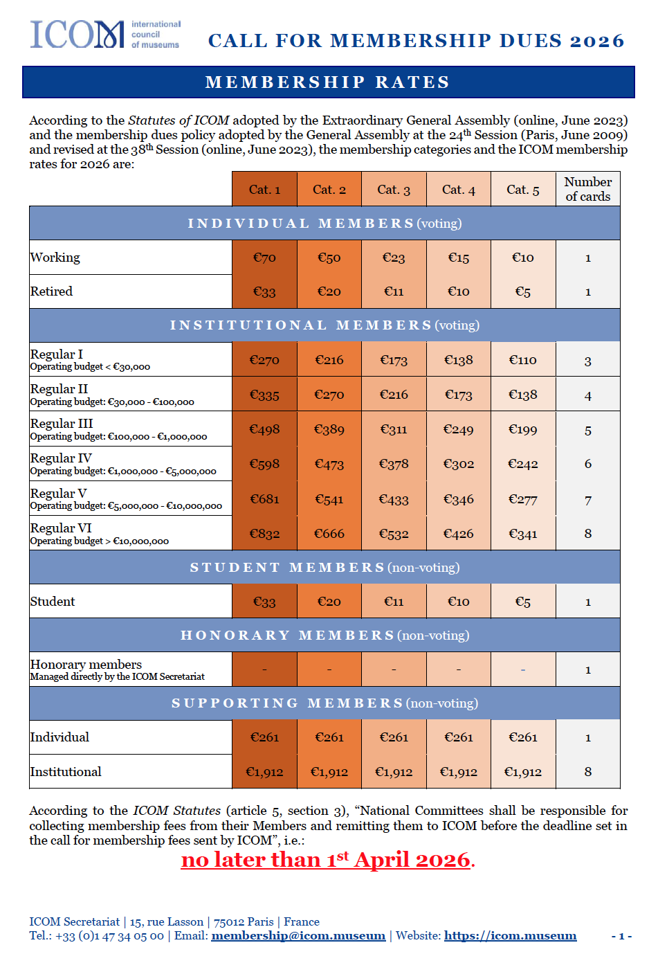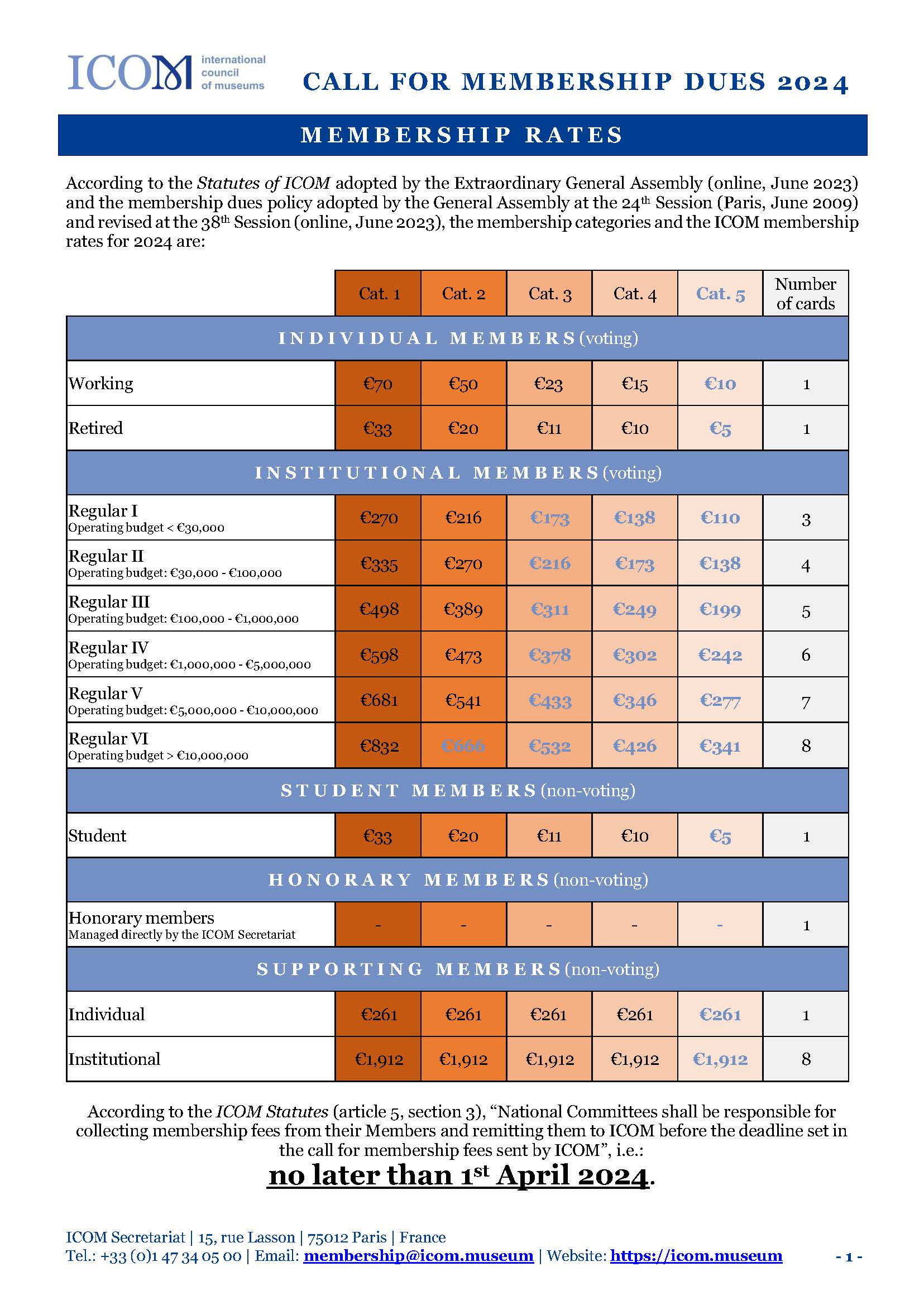 Cotizaţia anuală de membru instituţional se determină în raport cu categoria corespunzătoare bugetului anual în care se înscrie muzeul membru, fiind compusă din cotizaţia de membru - valoare euro (necesară eliberării vignetelor anuale aferente cardurilor ICOM ) şi din cotizaţia de funcţionare - valoare lei, conform tabelul de mai jos: